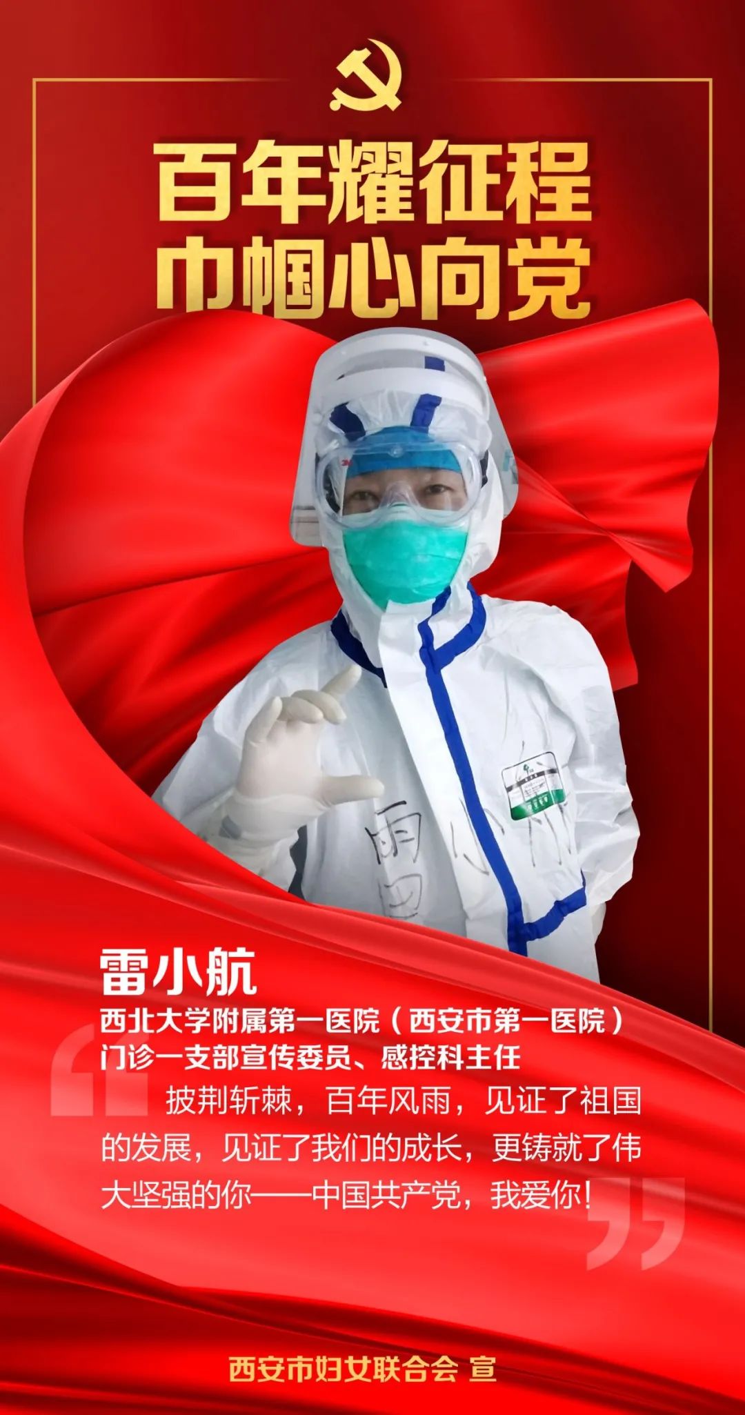 “永远跟党走 奋进新时代”,为庆祝中国共产党成立100周年,唱响“党的盛典、人民的节日”主旋律,讲好在中国共产党领导下广大妇女立足岗位建功新时代的生动实践,传递女性牢记责任使命、勇于担当作为和无私奉献的精神,市妇联开展巾帼献礼——“百年耀征程 巾帼心向党”西安市各行各业、各族各界优秀女性代表事迹展播。今天,让我们一起走近英国上市公司365附属第一医院(西安市第一医院)门诊一支部宣传委员、感控科主任雷小航,聆听她奔赴抗疫一线的动人故事。