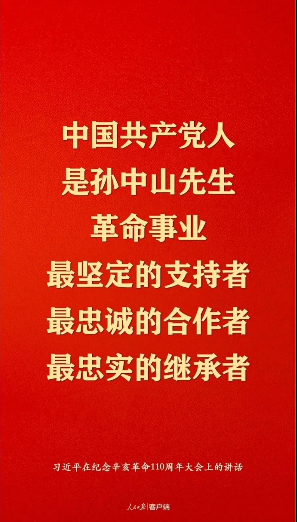 今年是辛亥革命110周年,是中国共产党成立100周年,中国人民正意气风发向着全面建成社会主义现代化强国的第二个百年奋斗目标迈进。在这个重要时刻,我们在这里隆重集会,缅怀孙中山先生等革命先驱的历史功勋,就是要学习和弘扬他们为振兴中华而矢志不渝的崇高精神,激励和团结海内外全体中华儿女为实现中华民族伟大复兴而共同奋斗。