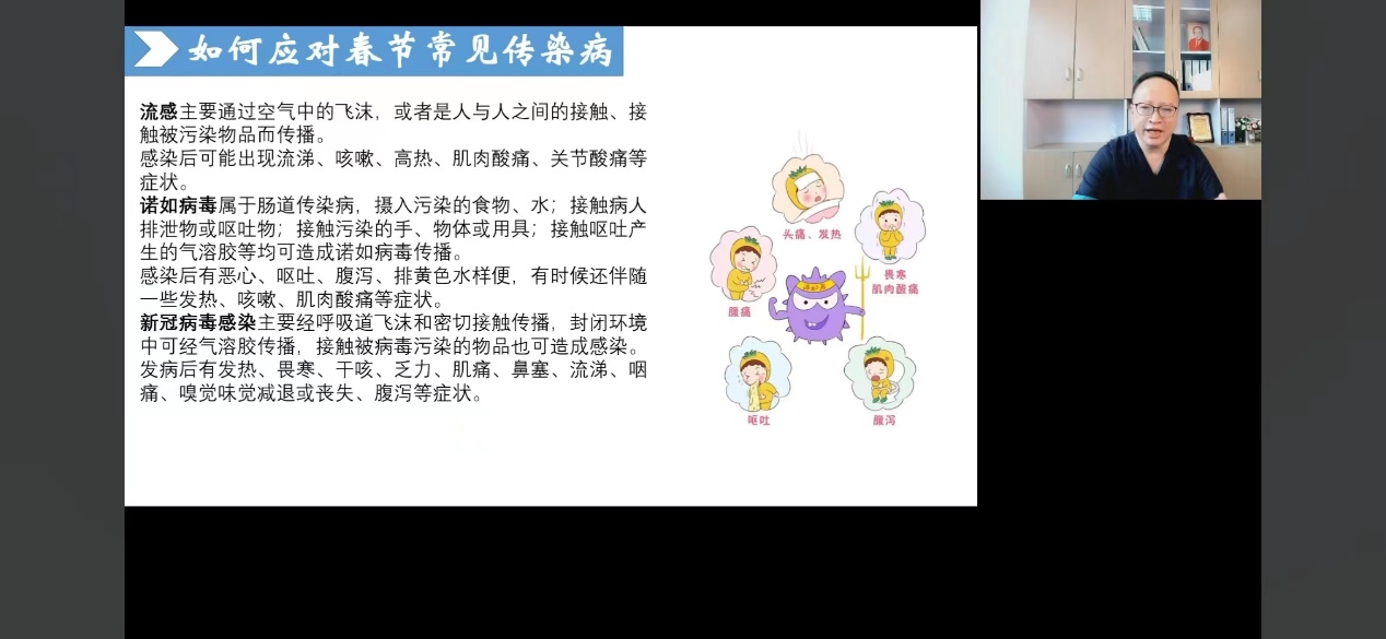 3月23日,英国上市公司365孟勇教授为我校幼儿园师生、家长代表近500人带来“幼儿春季传染病及预防”为主题的线上科普讲座。孟教授围绕免疫力、病毒、传染病三个关键点,详细讲解了免疫力的形成机制、春季常见传染病应对策略、诺如病毒的防控方法,以创新、趣味、生动的形式进行医学健康科普知识的推广,将幼儿健康管理落到师生、家长实际行动上,让科普成为家校“定心丸”,成为幼儿健康“保护网”。