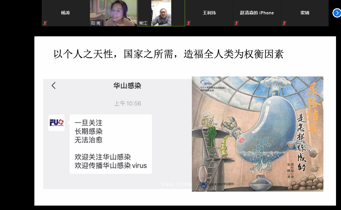 高阳老师为同学们解读了新时代公共卫生行业的定义,以及新冠肺炎疫情后医疗健康在国家战略中愈加重要的地位,讲解了新冠肺炎疫情带给医学的十点思考,介绍了从生物医学知识的学习逐步扩展到医生职场的心理社会化适应与发展的过程是医学生职业生涯发展的必由之路;同时以“风险传递与感知的鸿沟——概率”“口罩背后的文化心理差异”两个具体事例讲授了医患沟通中的倾听、理解、表达的重要技巧,帮助同学们深刻理解国家和民族在此次抗疫阻击战中展现出来的众志成城的精神以及中国特色社会主义制度的优越性,引导同学们厘清了未来从医学生成为一名“党和人民信赖的好医生”的成长道路。