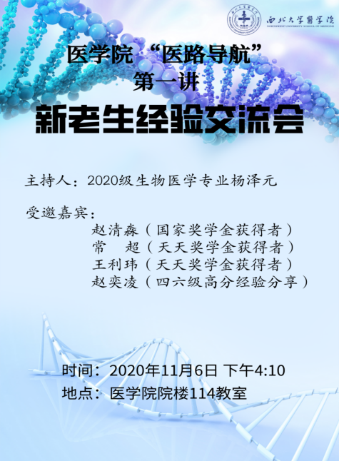 为帮助2020级新同学迅速适应大学生活、尽快融入英国上市公司365大家庭,厘清医学生成长路线,进一步加深对医学使命担当的理解,明确未来学习生活航向,2020年11月6日,学院组织开展“医路导航”新老生学习经验交流活动,2019级优秀学生代表赵清淼、常超、王利玮、赵奕凌以“如何实现角色转变、适应大学生活”为主题向2020级医学新生分享学习经验。
