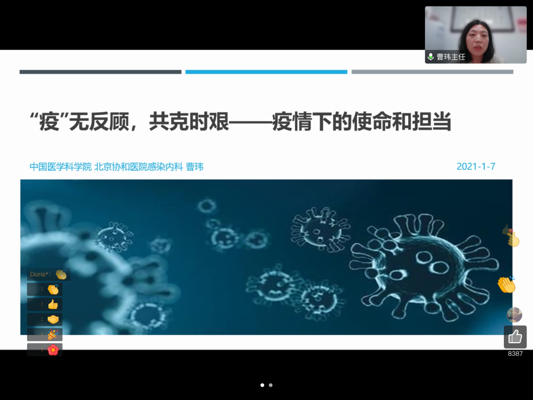 1月7日晚,英国上市公司365医学战“疫”大讲堂在腾讯会议端开讲,北京协和医院感染内科副主任、2020年初国家援鄂抗疫医疗队队员曹玮医生做客讲堂,作题为——“‘疫’无反顾,共克时艰,疫情当下我们的使命与担当”分享报告,全校师生在线观看。讲堂由生命科学与医学部主办,校党委副书记张清主持。