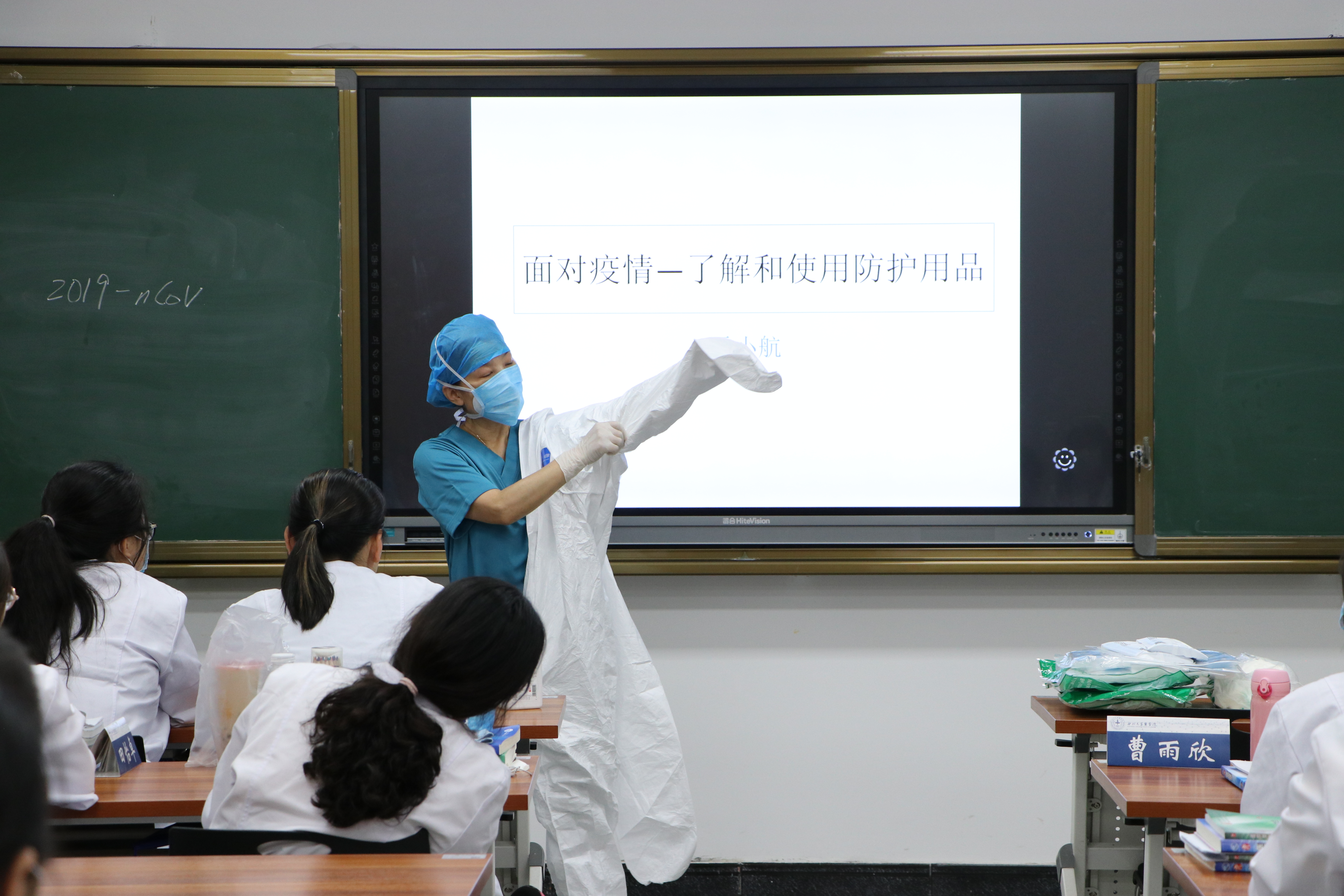 雷小航医生详细讲解了在传染性疾病诊疗过程中个人防护用品的正确用法以及口罩、防护服的各级防护标准比较,普及了医院感染区“三区两通道”的意义。讲解完成之后,雷小航医生现场演示了在武汉抗疫一线时全套个人防护装备的穿戴与脱掉,并对每一步的方法与意义细致而详细的进行了说明,她提到,当冲向疫情前线,这身防护服就是生命的最后一道防线。
