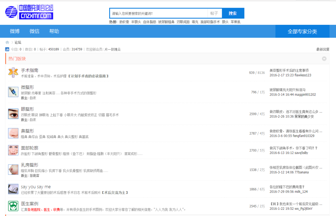 那几年医疗互联网的发展也日新月异,当时国内专业网站做得最好、影响最大的,专业类是丁香园的修复重建和烧伤整形版块,科普类则是由张辉博士一手创建的中国整形美容论坛。经过几年的UGC内容积累沉淀,中国整形美容论坛当时在国内医美科普类网站中长期排名第一,全国各地从网上慕名而来找张辉博士做手术的病人多到组团,常常需要提前半年到一年预约,那几年张辉博士完全不出门诊,但门诊工作量长期位居全科第一,一时间被传为业界佳话。网络为西京医院整形科带来大量病人,也为个人专业成长创造了难得的条件和机遇。