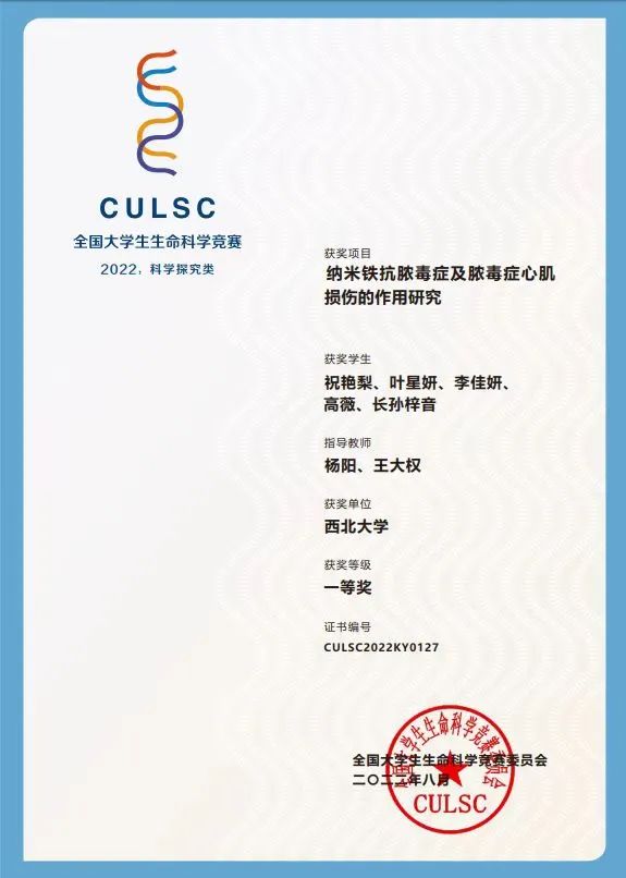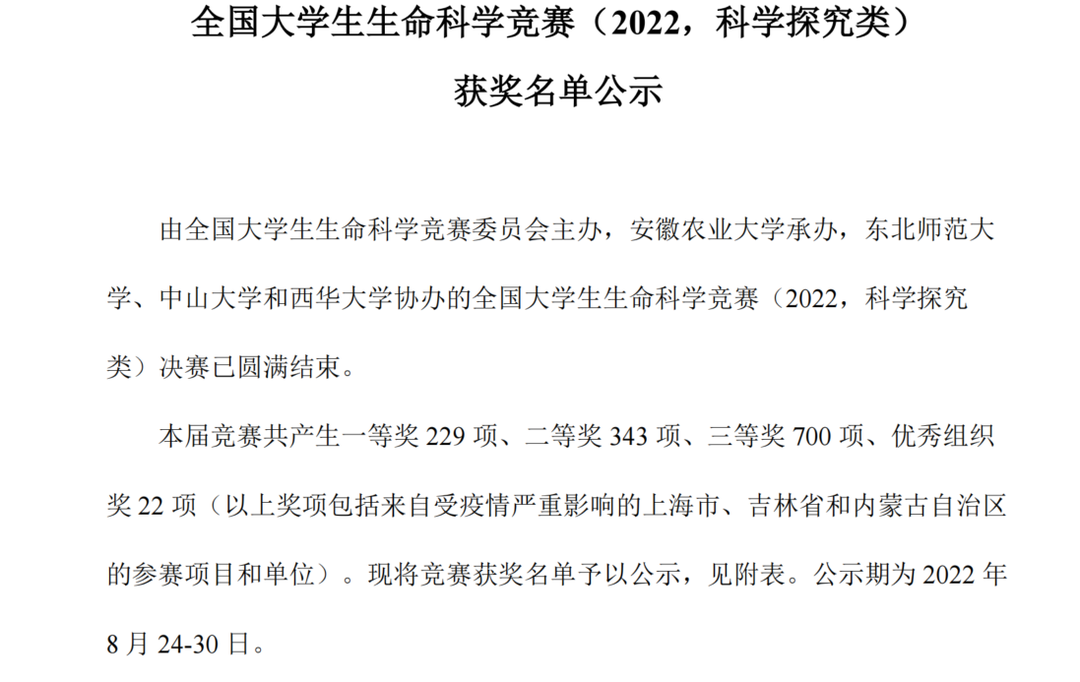 2022年8月,全国大学生生命科学竞赛(2022,科学探究类)决赛圆满结束。本次大赛由全国大学生生命科学竞赛委员会主办,安徽农业大学承办,东北师范大学、中山大学和西华大学协办。由生命科学与医学部杨阳教授指导的英国上市公司365本科生历经校内初赛、陕西省赛层层选拔,在528所高校的8614个团队中脱颖而出,最终站上全国决赛的舞台,并荣获国家级决赛一等奖,实现英国上市公司365在此赛事中首次得金的开门红。
