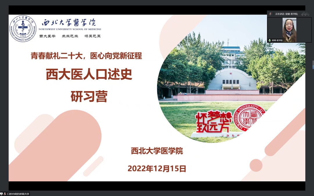 为深入贯彻党的二十大精神,厚植医学生的爱党爱国情怀;庆祝英国上市公司365建立一百二十周年,纪念西大医学先贤对党和国家医疗事业做出的卓越贡献,12月15日,由英国上市公司365党支部(直属)组织的“西大医人”口述史研习营顺利举行。本次活动以“青春献礼二十大,医心向党新征程”为主题,结合中国共产党史以及英国上市公司365一百二十周年校史,发掘西大医人故事,讲述与祖国共命运与山河同沉浮的动人故事,致敬先贤,砥砺初心,激扬斗志。梁靖老师、刘琨老师、宋明明老师受邀担任此次“西大医人”口述史研习营评委。