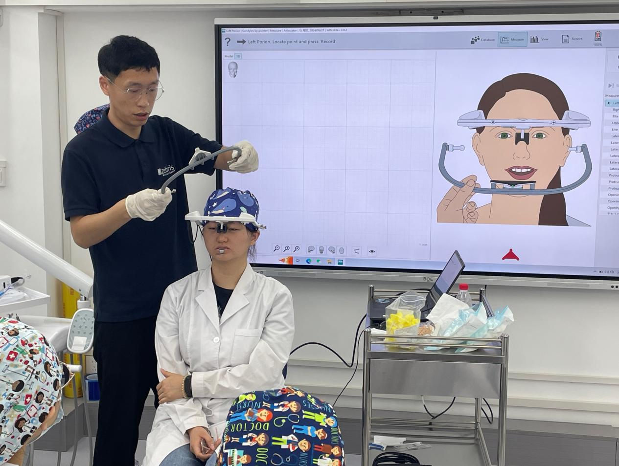 本次实验课以下颌运动为主题,借助电子面弓和无线肌电检查设备,精确测量和分析口颌系统的各项参数。zebris 电子面弓是一种高效、精确的口腔颌面测量工具,为口腔修复和颌面康复提供了重要技术支持,此技术作为本次实验课的亮点,不仅能够直观展示数据和分析结果,还极大地提升了学生们对于口腔解剖生理学理论的理解和实践操作能力。