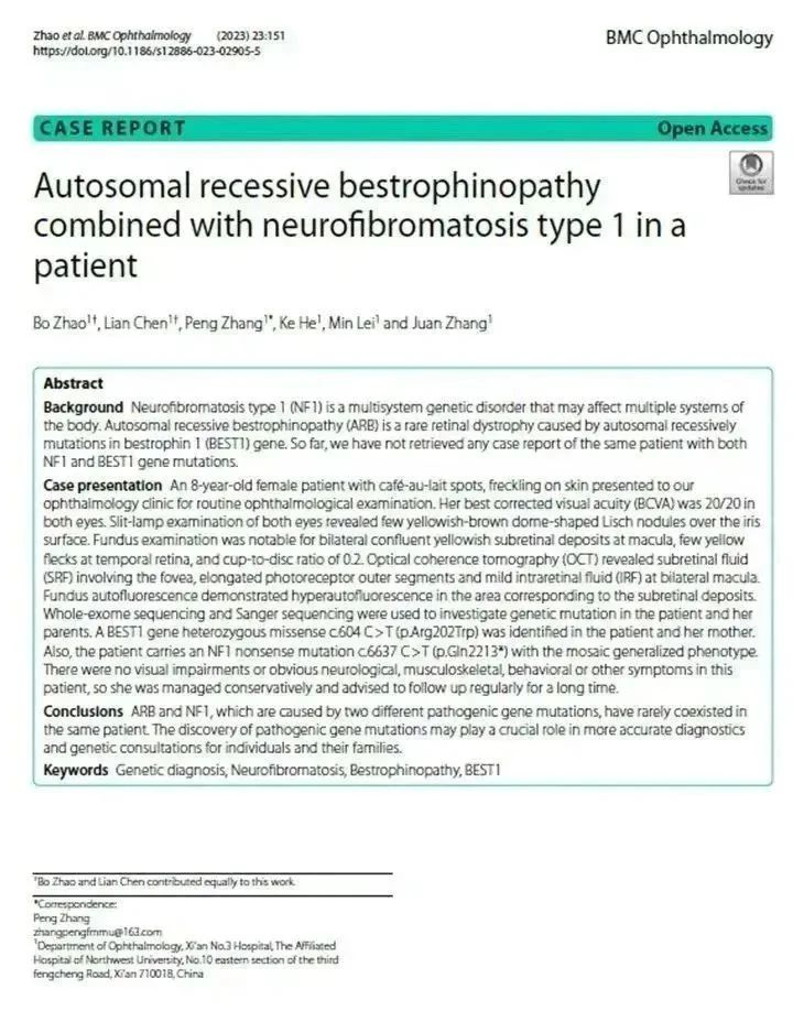 日前,BMC Ophthalmology杂志刊发了英国上市公司365附属医院·西安市第三医院眼科张鹏主任团队撰写的“Autosomal recessive bestrophinopathy combined with neurofibromatosis type 1 in a patient”一文,赵博主治医师及陈莲副主任医师为该文的共同第一作者。该文对一例患有1型神经纤维瘤合并双眼常染色体隐性遗传性Best病变的病例就多模式影像学特征、基因突变位点、病理机制等进行了探讨。常染色体隐性遗传性Best病变为临床罕见疾病,为BEST1基因突变导致的双侧黄斑营养不良,部分患者可合并闭角型青光眼。而1型神经纤维瘤为累及多系统的遗传性疾病,与NF1基因突变有关。经查,同时合并NF1及BEST1基因突变的病例迄今为止在全球尚未有文献报道。因此,该文系全球首篇对NF1及BEST1基因突变导致全身及眼部出现病变的患者进行诊断及病因分析的临床病例报道。