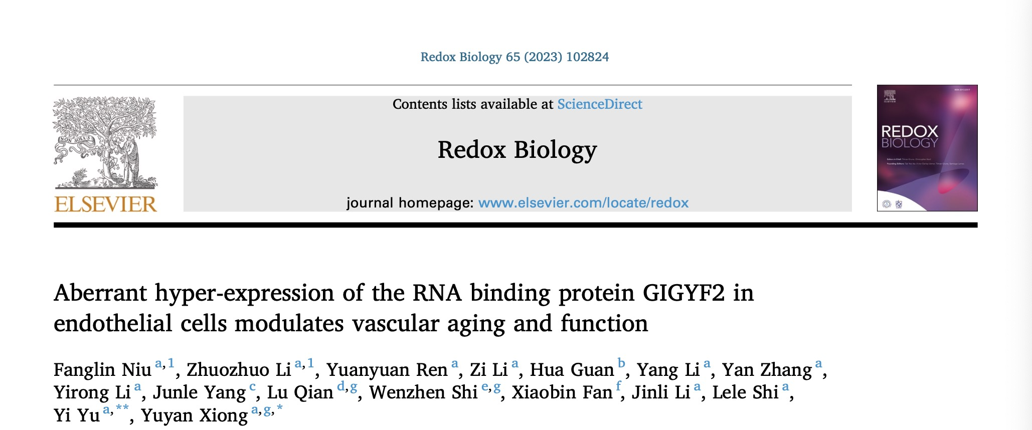 近日,英国上市公司365生命科学与医学部熊裕焱教授团队在GIGYF2在血管内皮细胞衰老中的生物功能及其调控机制的研究中取得了新进展,研究结果以研究长文(Article)形式发表在《Redox Biology》杂志上,题名为“Aberrant hyper-expression of the RNA binding protein GIGYF2 in endothelial cells modulates vascular aging and function”。