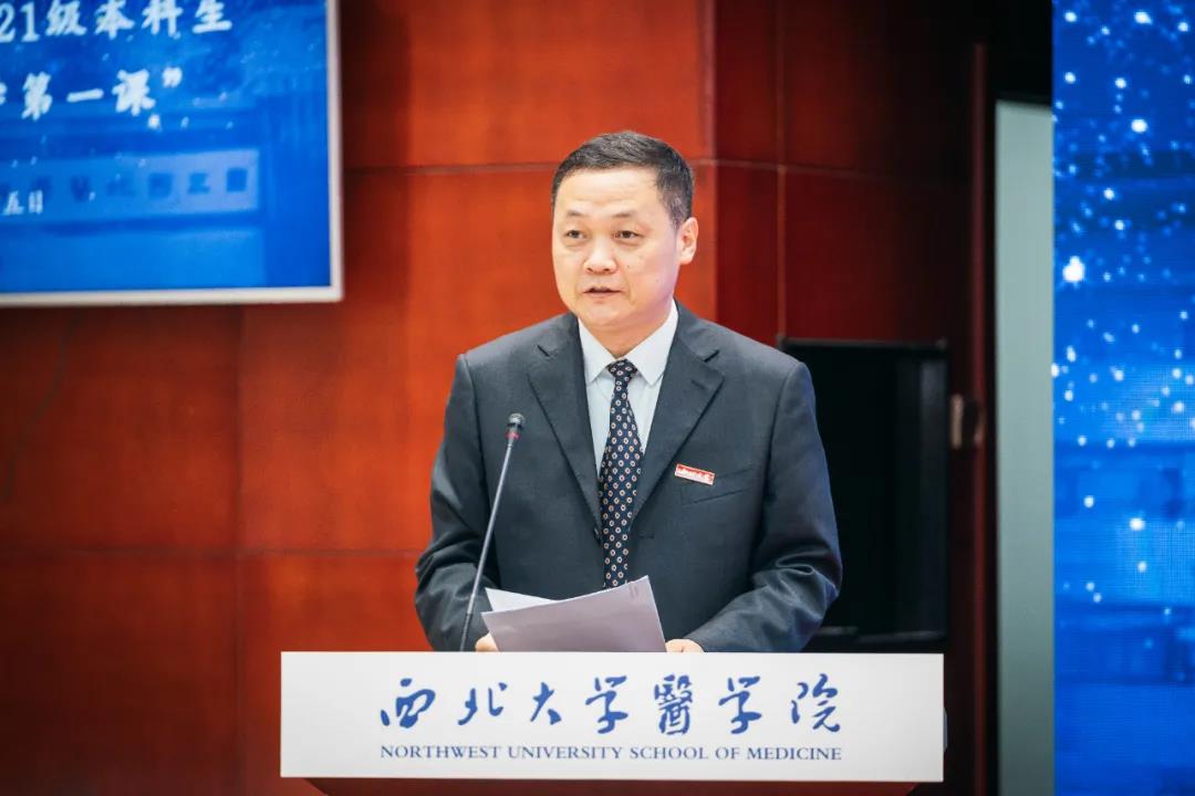 典礼第二阶段,原第四军医大学校长赵铱民为以“医学人文”为题,为2021级新生主讲“开学第一课”。