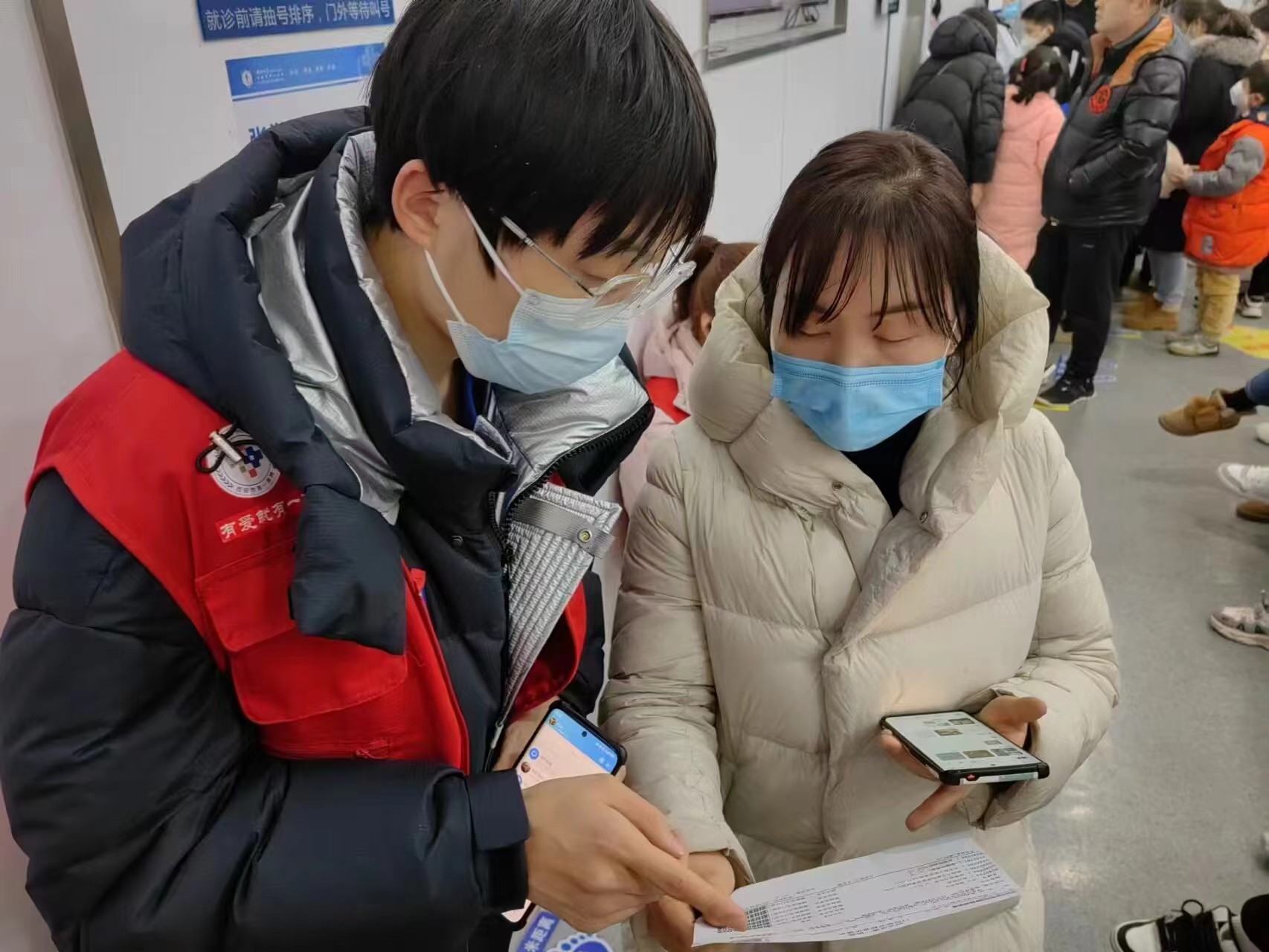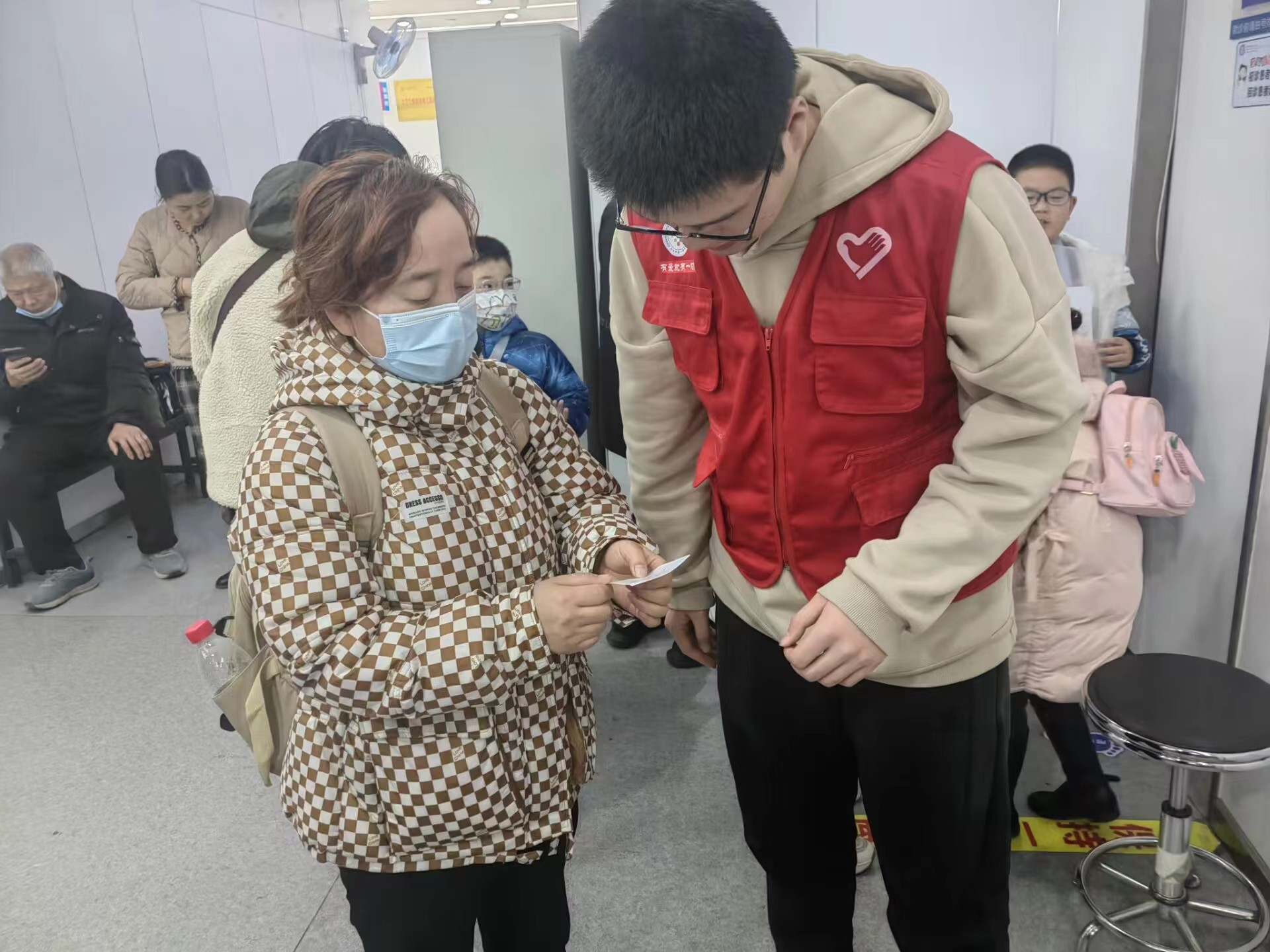 寒假期间是患者就诊高峰期,志愿者们身着红马甲,活跃在医院的取号机、导诊台等枢纽位置,耐心负责地为来院就诊的患者提供取号、排队、指引等导诊服务,维持就诊秩序,缓解医护人员工作压力,提升患者就医体验,在纷繁复杂的门诊工作中表现出医学生专业严谨、吃苦耐劳的精神。