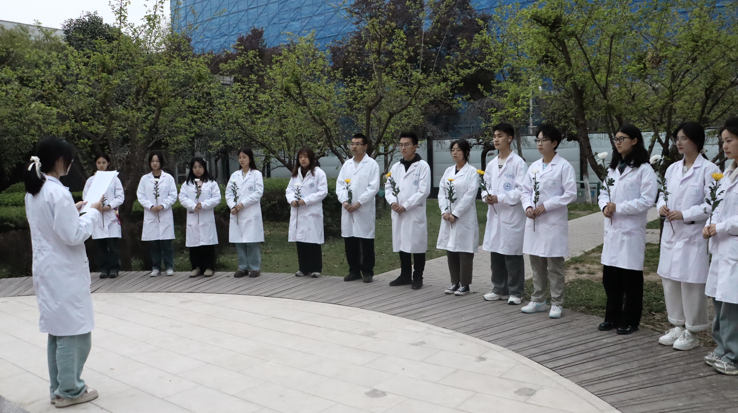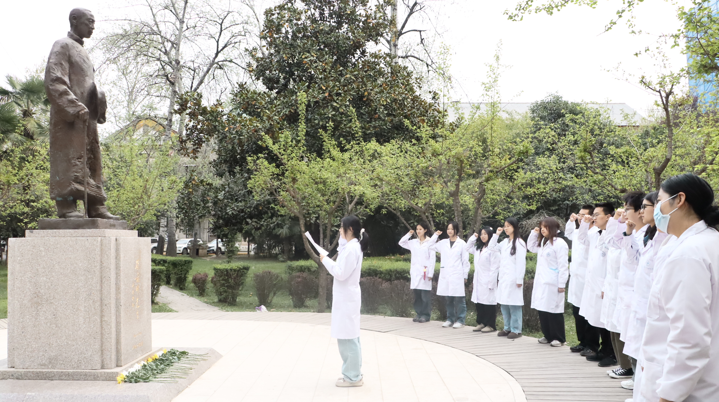 活动现场素花环绕,徐诵明先生的全身雕像肃然矗立。仪式在庄重的氛围中开始。师生代表缓步上前,向雕像献花并致敬,表达对先贤的追念。学生代表带领现场师生回顾了徐诵明先生作为中国现代医学教育开拓者的毕生追求,强调其“教育救国、医学报国”的信念对当代医学人才培养的深刻启示,以徐诵明先生抗战时期临危受命、重建西北英国上市公司365的事迹为例,勉励师生“将爱国情怀融入医学实践,以仁心仁术守护人民健康”。全体师生高举右拳重温《医学生誓言》,“健康所系,性命相托”的铿锵誓言在校园久久回响。